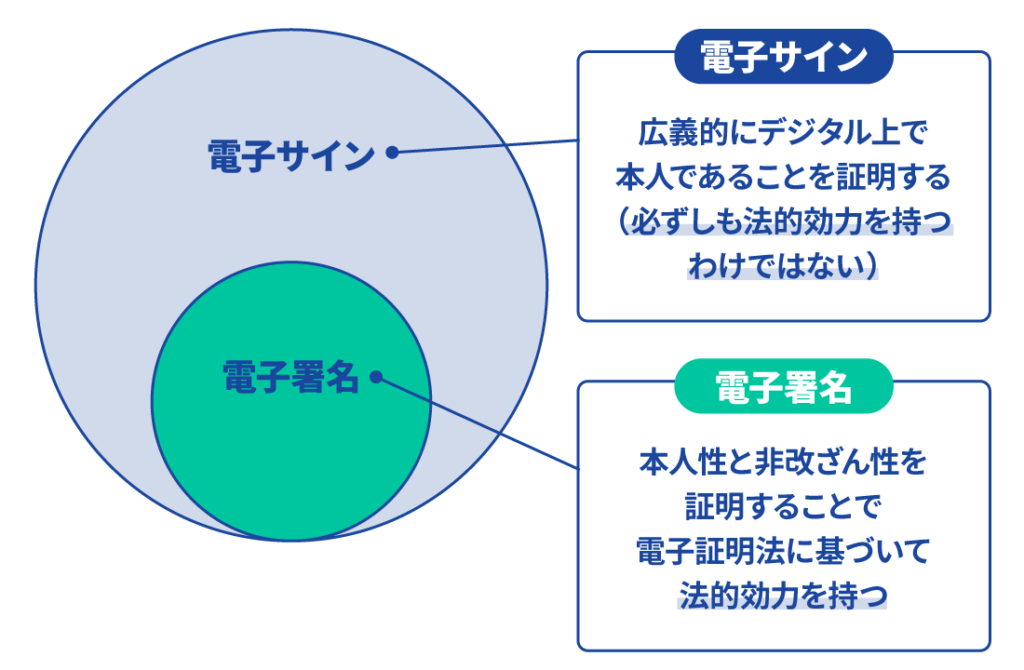 電子サインは広範な同意の手段を指す一方で、法的効力は必ずしも持ちません。一方、電子署名は電子サインのひとつで、公開鍵暗号方式を用いて、第三者認証機関による証明が必須であり、法的効力を持ちます。