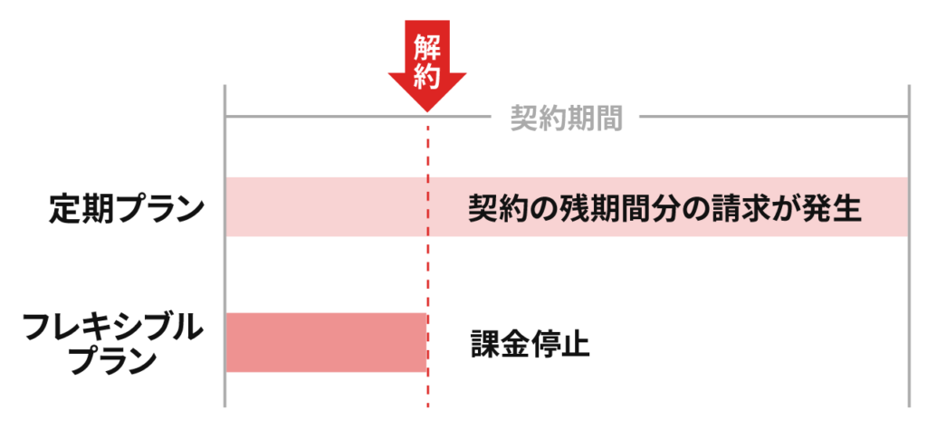 フレキシブルプランでは、解約と同時に課金が停止されます。しかし年間/定期プランを利用している場合は、残期間分の請求が発生するので注意が必要です。契約期間がどれくらい残っているかを確認してから解約の手続きを行いましょう。