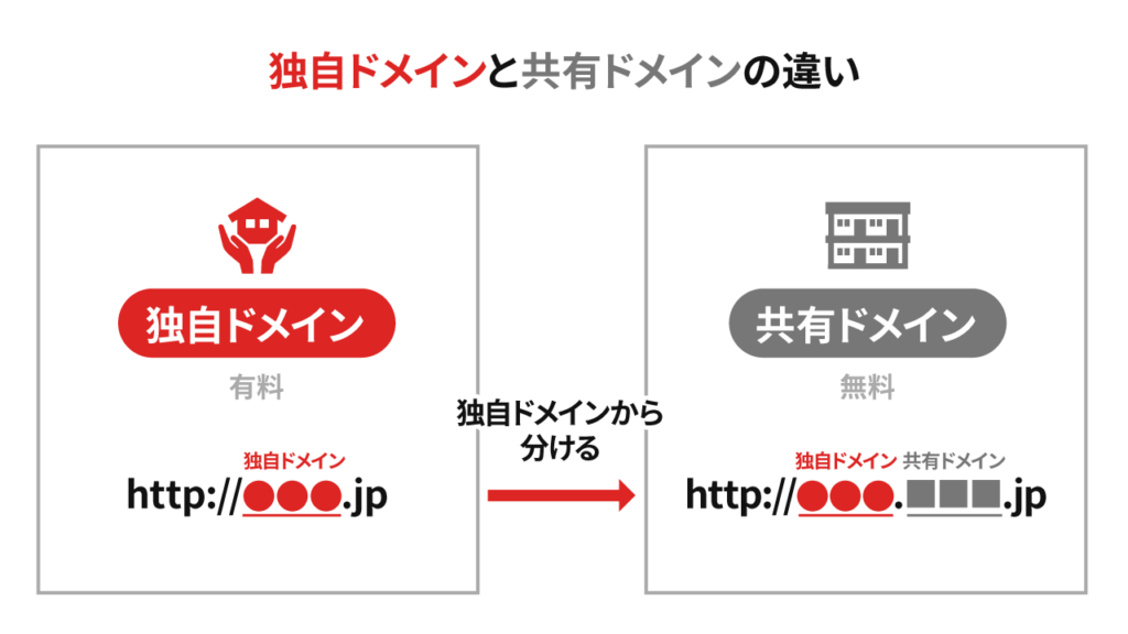 例えるなら、独自ドメインが「戸建て」、共有ドメインが「複数世帯が集まるマンション」です。