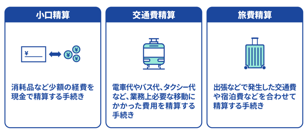 一般的な会社で行われる経費精算としては、小口精算、交通費精算、旅費精算が挙げられます。
