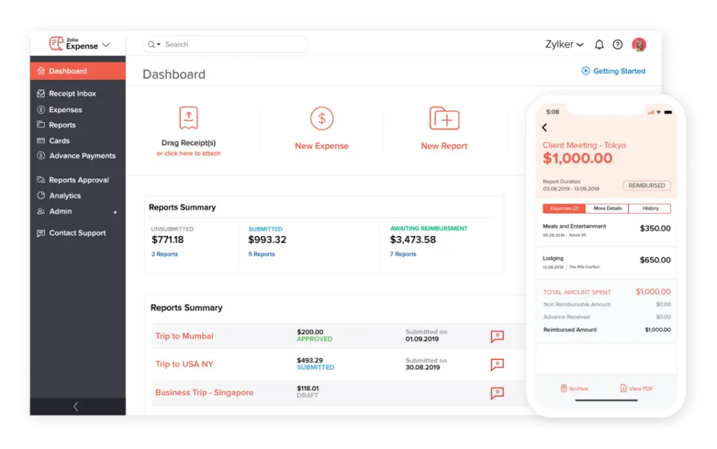Zoho Expenseは、世界中で使用されている経費レポート作成アプリです。レシートの自動スキャンやカード取引の自動取り込みが可能で、会計ソフトウェアとの連携にも対応しています。