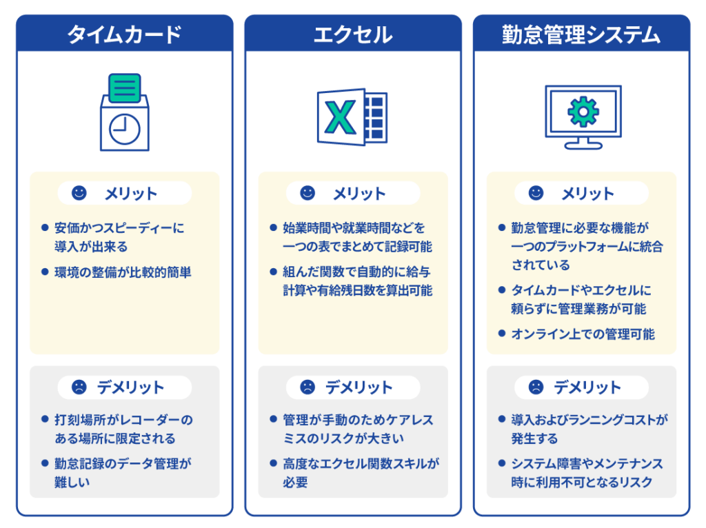 勤怠管理を正しく実施するうえでは、以下のような手法が各社で採用されています。自社にとってどのような手段が最適なのか、以下を確認の上検討してみましょう。
