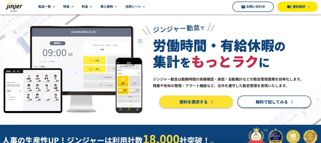 ジンジャー勤怠は1万8,000社以上の導入実績がある人気の高い勤怠管理システムです。パソコンやスマホ、タブレットなどを使った打刻やシステム管理が可能で、直感的な操作性によるケアレスミスの少ない勤怠管理をサポートします。
