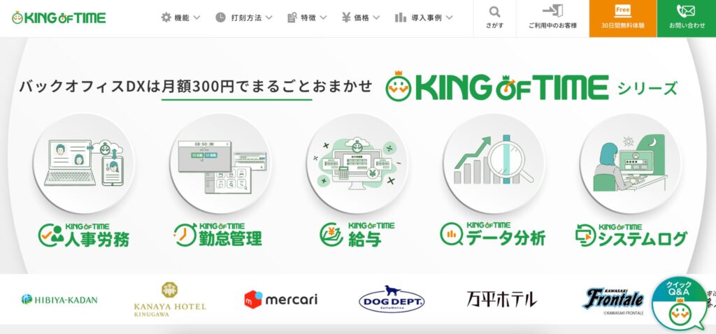 KING OF TIMEは月額300円から利用ができるコストパフォーマンスが魅力の勤怠管理システムです。あらゆる業界の勤怠管理に対応しており、生体認証やICカードなどの柔軟な打刻機能を実装できる点が評価されています。