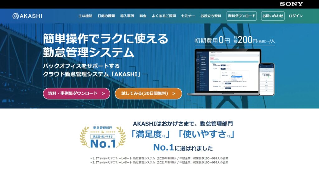 AKASHIは、ソニー(SONY)のグループ企業が提供するクラウド型勤怠管理システムです。スマホアプリやICカードといった打刻方法が豊富で、従業員の出勤・退勤時刻を正確に把握できます。