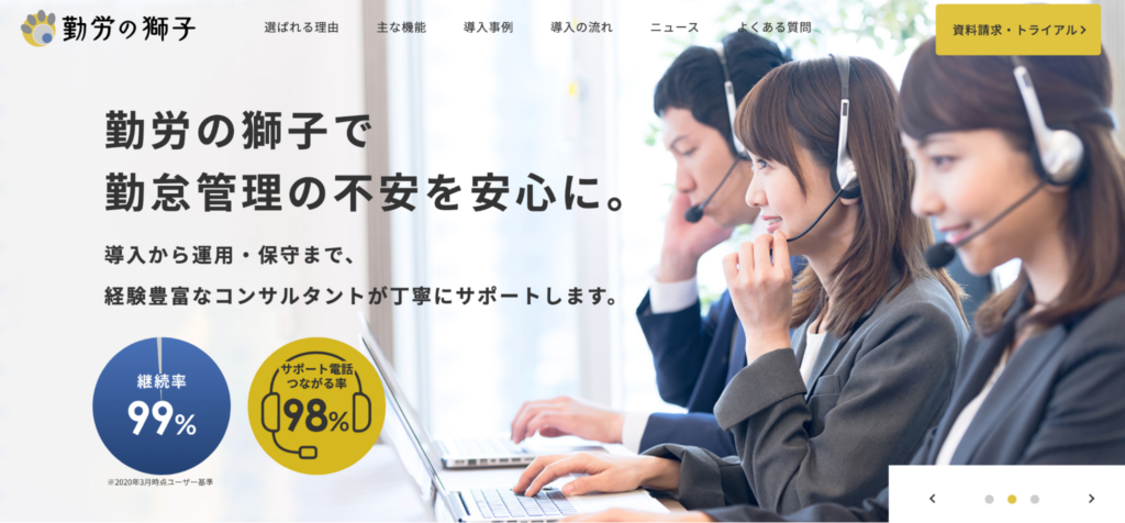 勤労の獅子は、複雑な勤怠管理にも対応できるクラウド型の勤怠管理システム。親身なサポートが強みで、導入から運用、保守にいたるまで、丁寧な支援を受けられます。