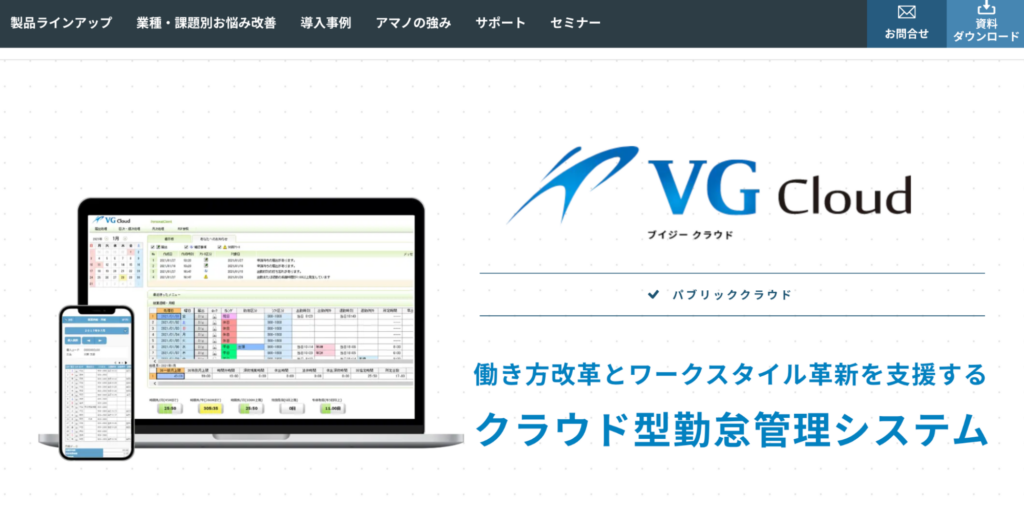VG Cloudは、ワークスタイルの革新を支援するクラウド型の勤怠管理システム。ハイエンドモデルとして高い評価を受けている「TimePro-VG」の主要機能はそのままに、リーズナブルな価格で利用できます。