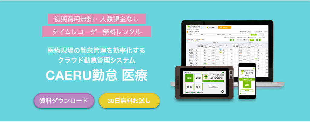 | CAERU勤怠 医療 | ・打刻ミスのリアルタイムアラート ・AIによる勤怠の自動チェック | ・タイムレコーダーの無料レンタルが可能 ・料金が拠点毎に一律 ・各病院・クリニック向けにカスタマイズ可能 | 大病院など利用者数が多い病院・クリニックの担当者 | ・初期費用:無料 ・システム利用料:7,500円(税別)/1拠点 | ・PC ・タブレット ・ICカード | ・電話 ・メール |