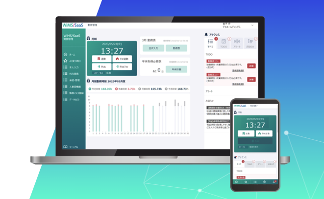 WiMS/SaaS 勤務管理システムは、テレワークやフレックスタイムといった、大企業の複雑な勤務形態に対応します。勤務状況のリアルタイム追跡、過重労働アラート機能など、従業員の健康やワークライフバランスに配慮された機能を利用できます。