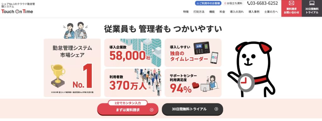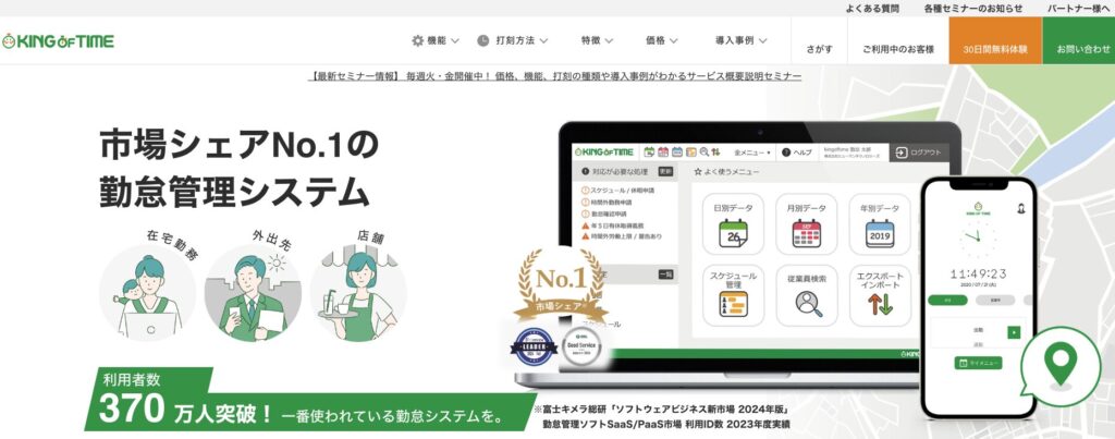 打刻や勤怠状況の管理が簡単に分かるUIで、30日間の無料トライアルで使い心地を確認できます。さらに、専属社労士による導入サポートや、「MFクラウド給与」といった他システムとの連携も可能。シンプルな操作性を重視する企業におすすめです。