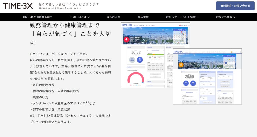 TIME-3Xは、多様な労務管理と働き方に対応した勤怠管理システムです。専用のポータルページがあり、スマートフォンやタブレットなど、マルチデバイスに対応しています。