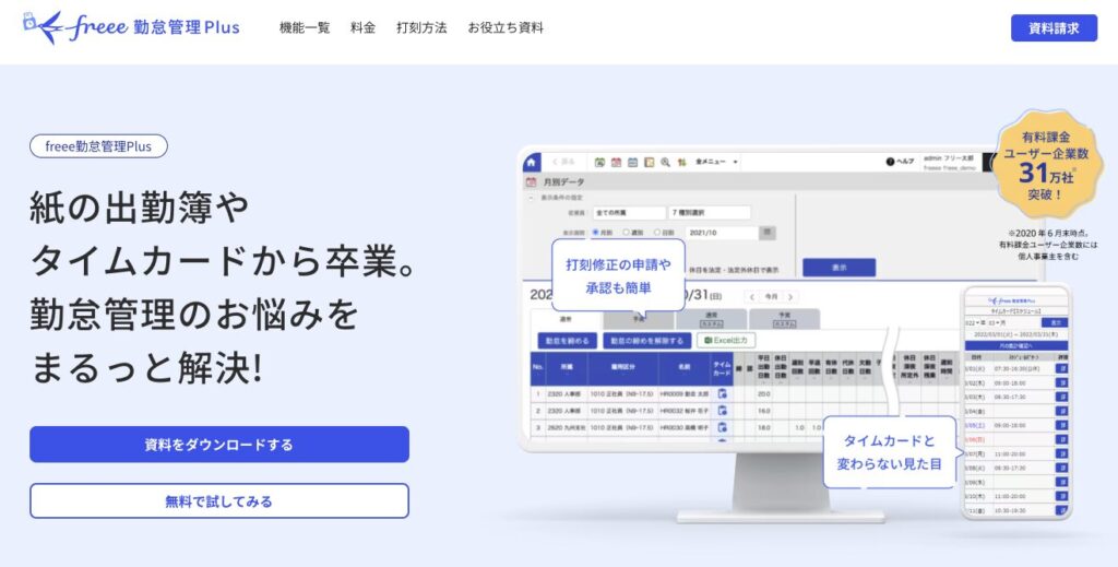 freee勤怠管理Plusは、多彩な機能を搭載した、クラウド型の勤怠管理システムです。PCやスマートフォンからの打刻、ICカードや生体認証など、豊富な打刻方法を提供。テレワークやシフト制などの多様な就業形態に柔軟に対応します。