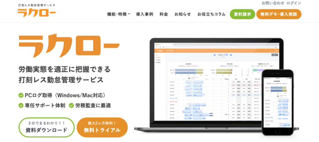 ラクローは、PCログを活用した「打刻レス」の勤怠管理システムです。従業員のPC起動・終了、スリープ、画面ロック・アンロックなどのログを自動取得し、打刻漏れや未払い残業などの労務リスクを低減します。Office365やGoogle Workspaceの予定表、メール、Slackとも連携可能です。