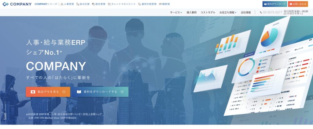 COMPANYは、大企業向けのクラウド型の勤怠管理システムです。フレックス・裁量労働・変形労働など、多様な勤務形態に対応します。複数人の勤務実績を一つの画面で登録できるなど、大人数向けの機能が特徴です。