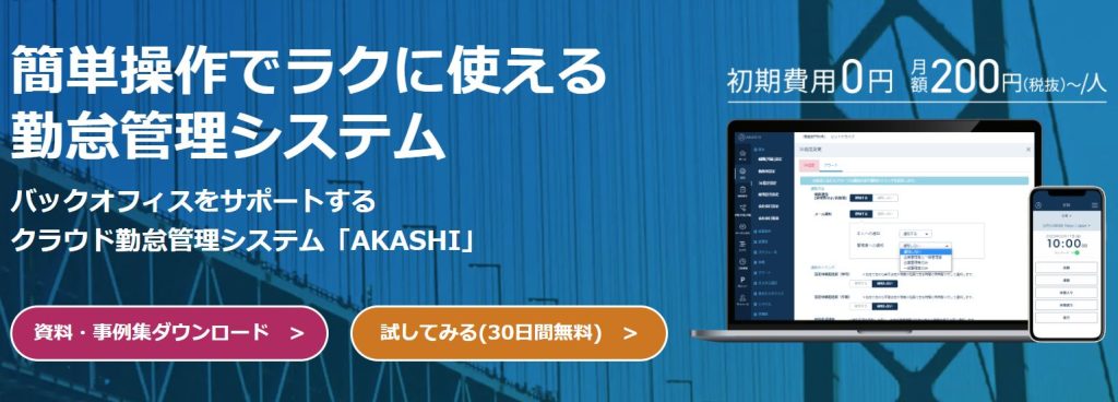 AKASHI自体は勤怠管理、工数管理、シフト管理などを備え、従業員1人あたり月額220円(税込)から利用できます。また、初期費用は無料ですが、55,000円(税込)からの初期設定サポートを受けられます。