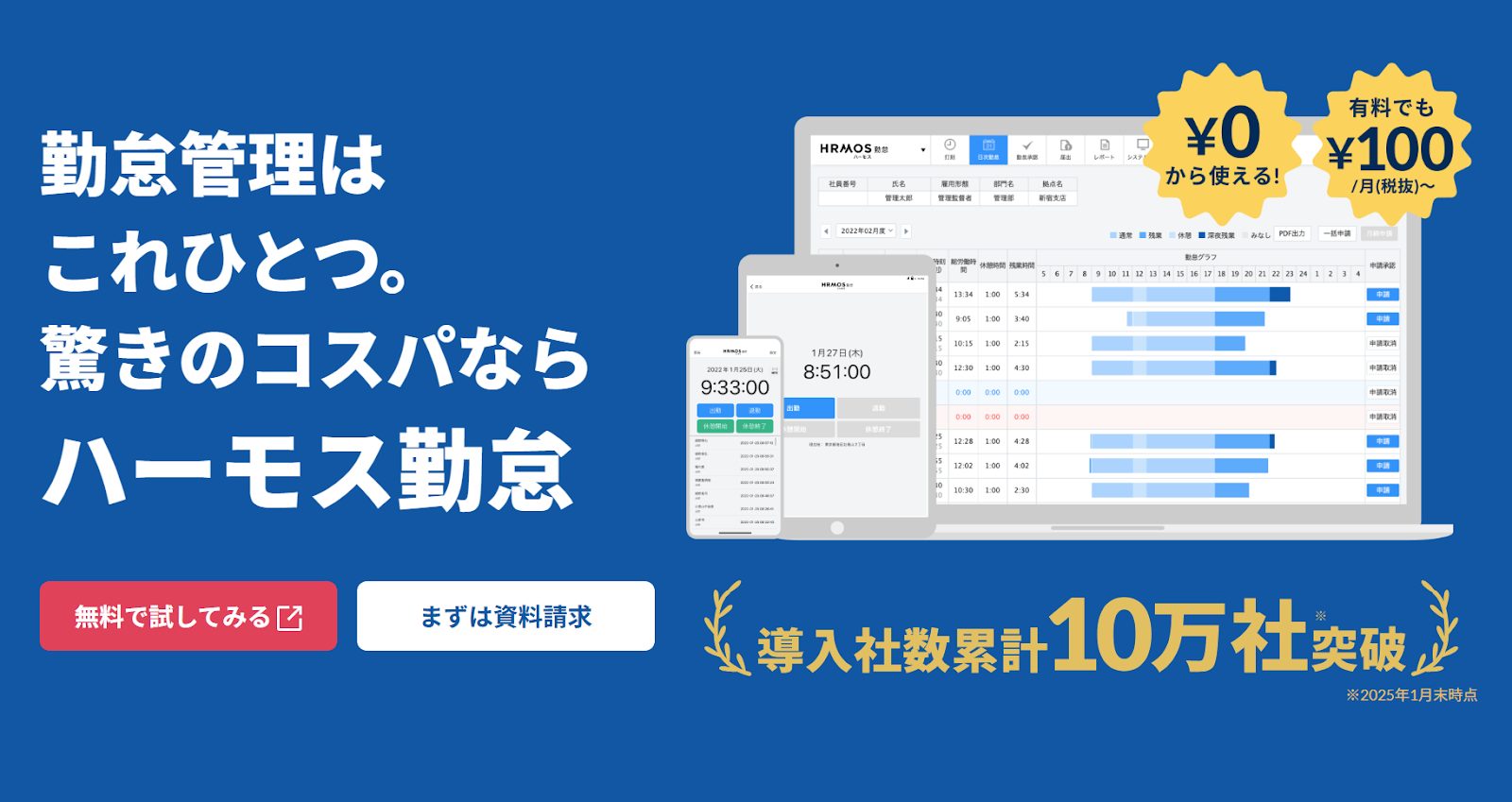 HRMOS勤怠は、勤怠管理、休暇管理、シフト管理などの基本機能を備え、クラウド上でリアルタイムにデータを確認できます。料金は月額制で、30アカウントまで無料で利用可能です。
