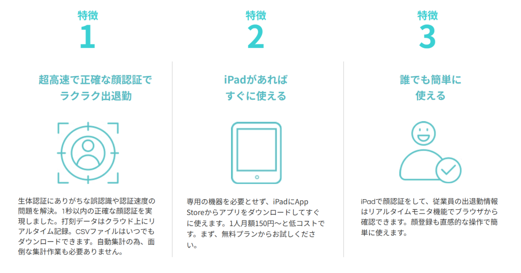 | ジョブカン勤怠管理 | 「FaceMe®」を搭載したiPadアプリを利用可 | 1ユーザーあたり220円〜(最低10人分から) |