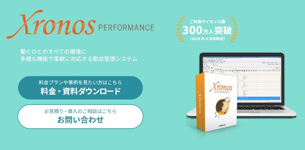 クロノスPerformanceは、PC・スマホ・ICカード・生体認証など多様な打刻方法に対応し、夜勤や中抜け勤務など複雑な勤務形態を正確に集計できる勤怠管理システムです。