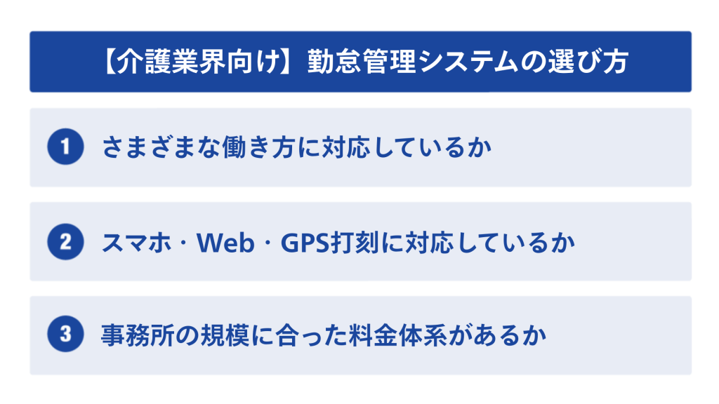 勤怠管理システムは種類が多く、どれを選ぶべきか判断が難しいものです。介護業界では勤務形態の複雑さや現場の分散など特有の課題があるため、それらに対応できる機能を備えているかを重点的に確認しましょう。