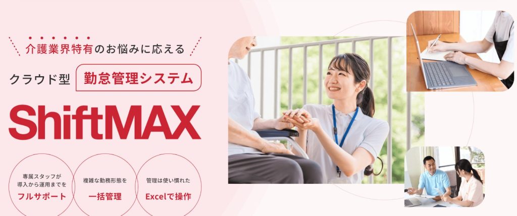 シフトマックスは、介護業界の複雑な勤務形態に対応したシフト・勤怠管理システムで、PC・スマホ・タブレットからの打刻に対応しています。夜勤や複数回の出退勤、中抜け勤務などを正確に集計でき、訪問介護の直行直帰にも柔軟に対応します。
