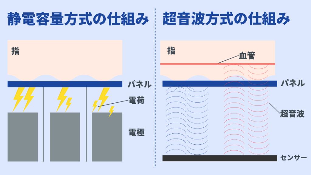 指紋データの読み出し方には、主に静電容量方式と超音波方式の2つがあります。
