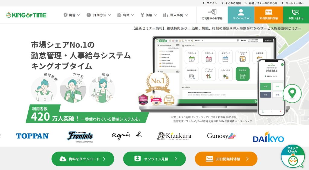 出典:勤怠管理・人事給与システム市場シェアNo.1 KING OF TIME(キングオブタイム)