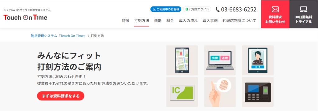 Touch On Timeは、株式会社デジジャパンが提供する勤怠管理システムです。打刻方法はPCやスマホ、ICカードに加え、専用タイムレコーダーによる生体認証にも対応しています。