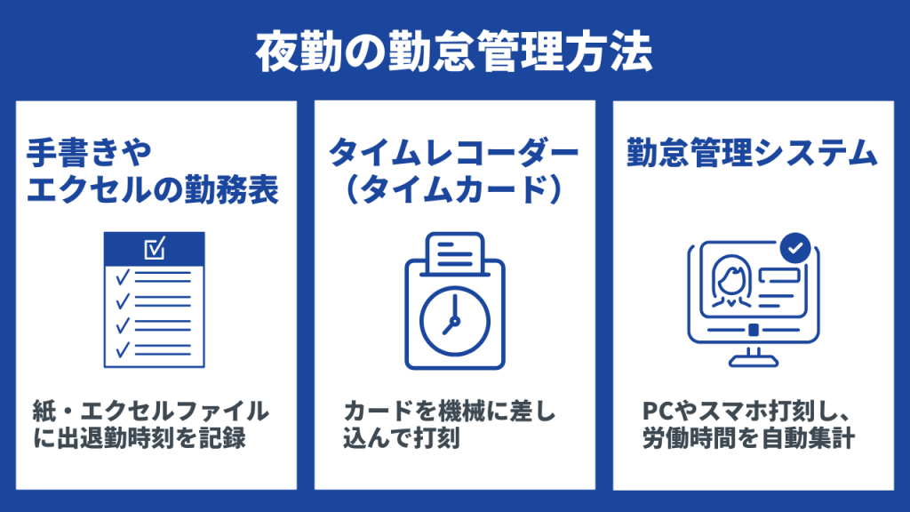 夜勤の主な勤怠管理方法には、次の3種類があります。
