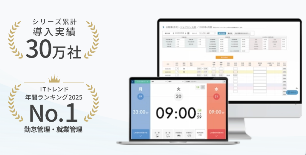 ジョブカン勤怠管理は、シリーズ累計導入実績が30万社(2026年2月時点)を超えるクラウド勤怠管理システムです。中小企業から大企業まで幅広い規模の企業に利用されています。