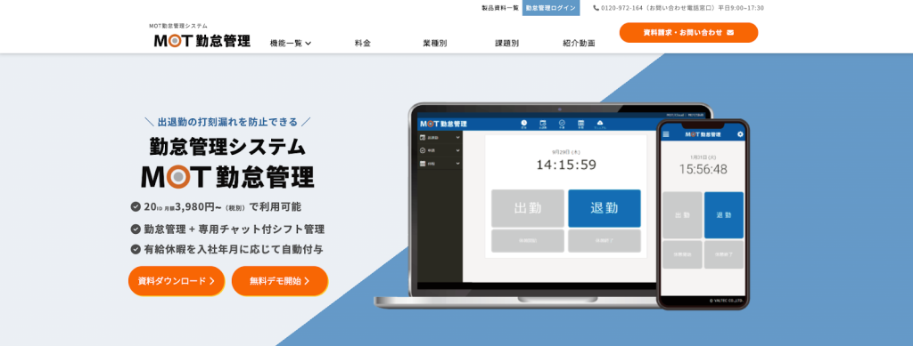 MOT勤怠管理は、クラウド電話サービス「MOT/TEL(モッテル)」と連携したクラウド勤怠管理システムです。