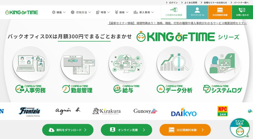 KING OF TIMEは、株式会社ヒューマンテクノロジーズが提供するサービスです。勤怠管理や給与計算など、バックオフィス業務に必要な機能がひとつのシステムに揃っています。