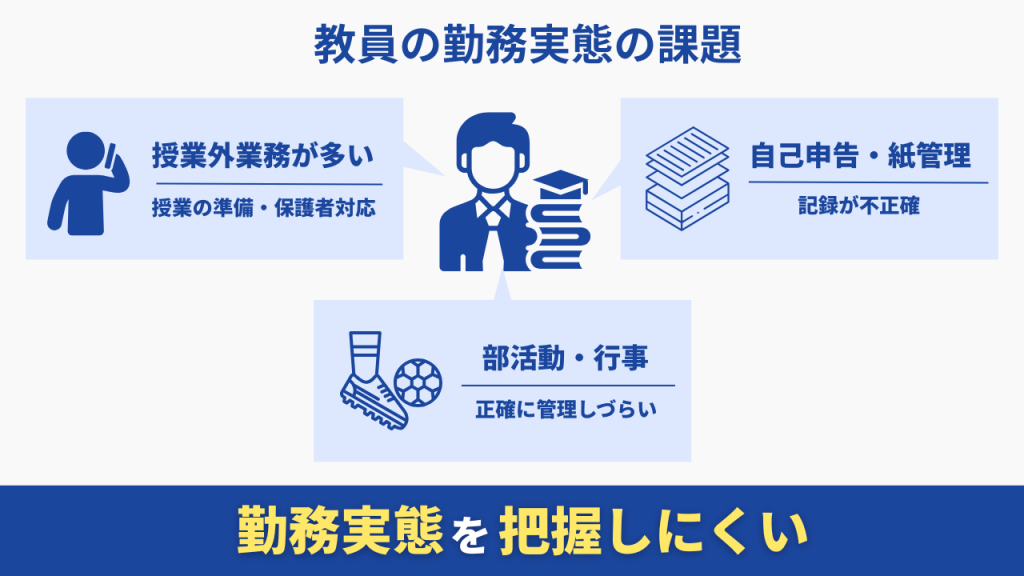 学校では、授業準備や保護者対応など授業以外の業務が多く、実際の労働時間を把握することが困難になりがちです。