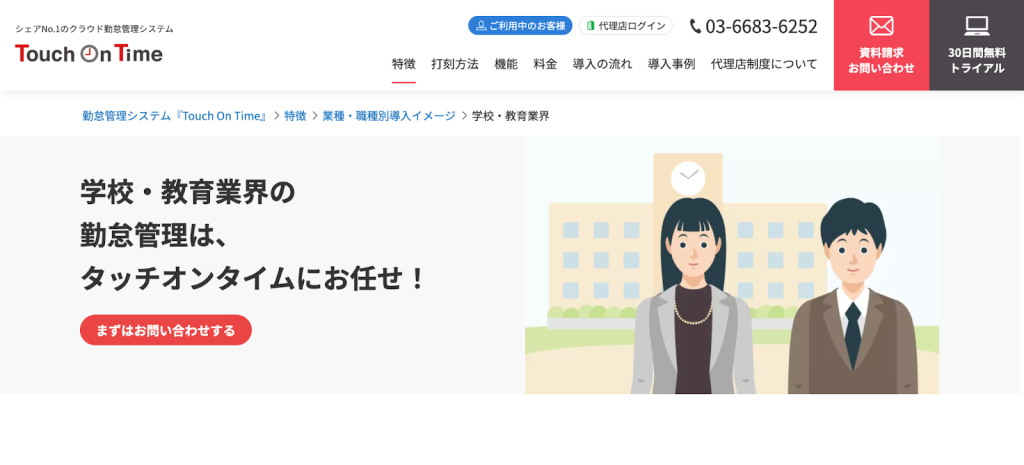 タッチオンタイムは、ペーパーレス化や働き方改革を支援するクラウド型勤怠管理システムです。学校特有の自己申告型の出退勤や手作業集計の課題を、打刻の徹底と自動集計により効率化します。
