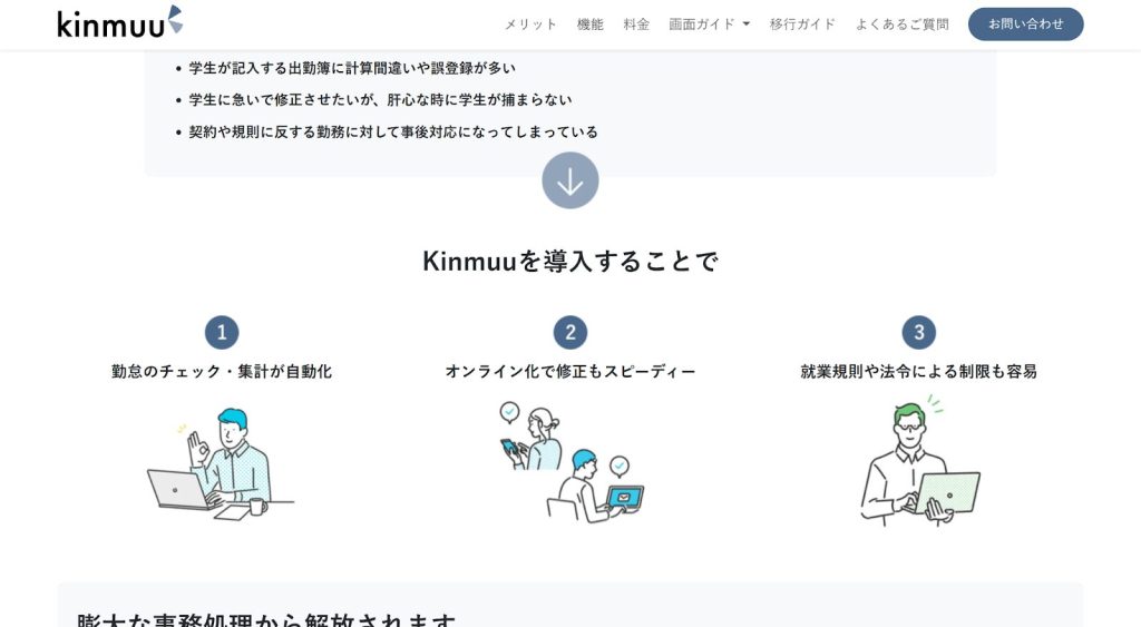 | Kinmuu | TA特有の承認フローを再現しやすい | ・学生アルバイトの勤怠管理に悩んでいる大学 |