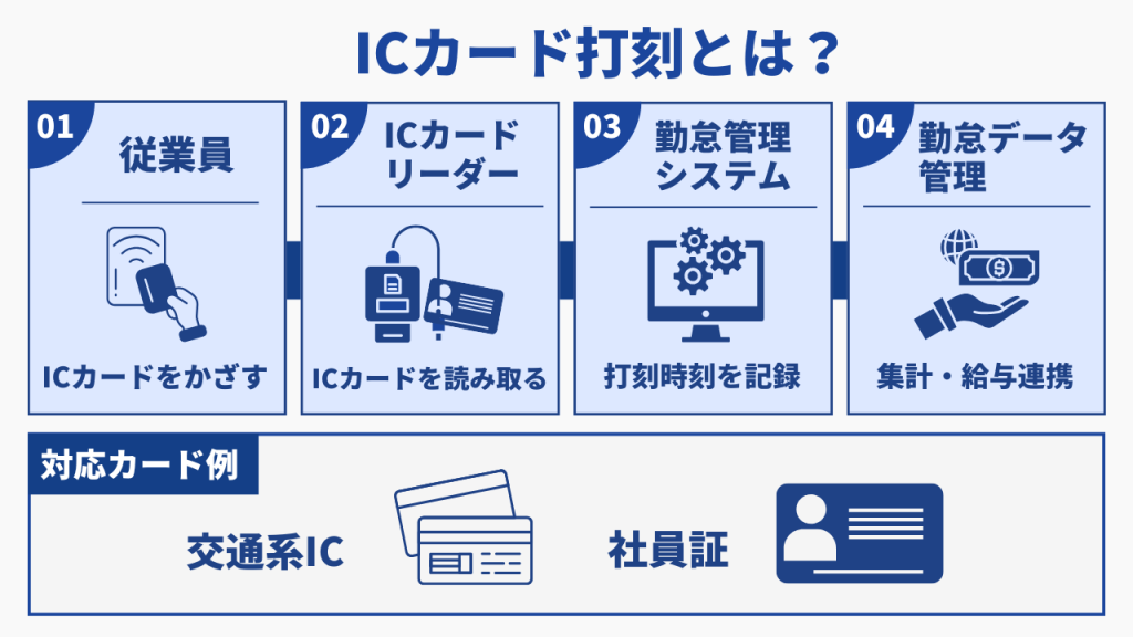 交通系ICカードや社員証をそのまま活用できるため、打刻の正確性向上や管理業務の効率化につながる点がメリットです。