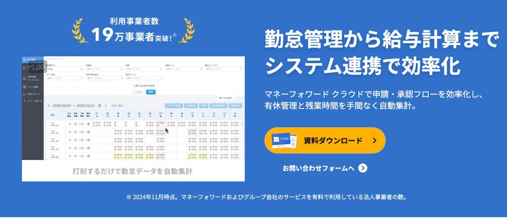 マネーフォワード クラウド勤怠は、利用者事業数19万を誇る勤怠管理システムです。(※ 2024年11月時点。マネーフォワードおよびグループ会社のサービスを有料で利用している法人事業者の数)