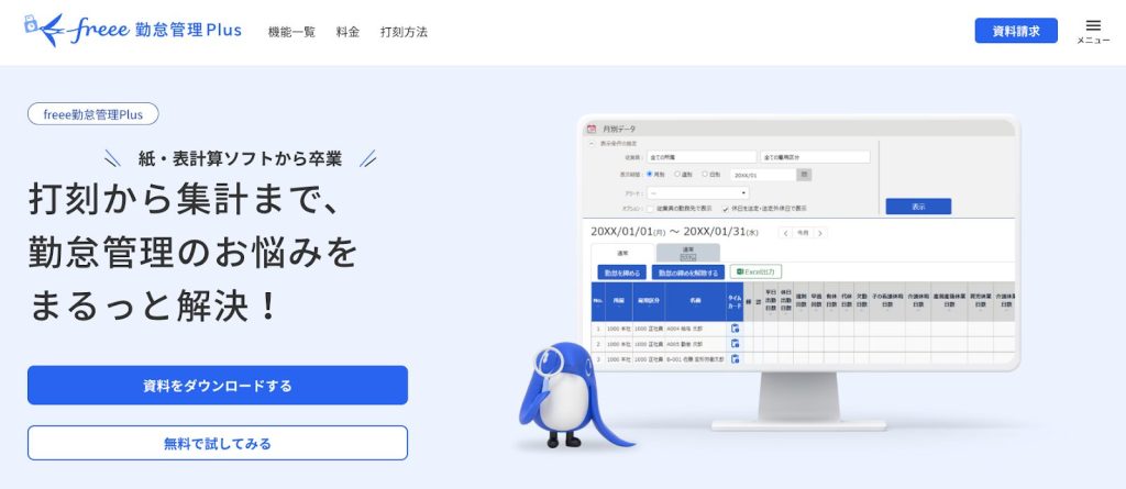 freee勤怠管理Plusは、豊富な機能が魅力のクラウド型勤怠管理システムです。PCやスマホ、ICカード、生体認証、GPS、チャット打刻など、多彩な打刻方法に対応しています。