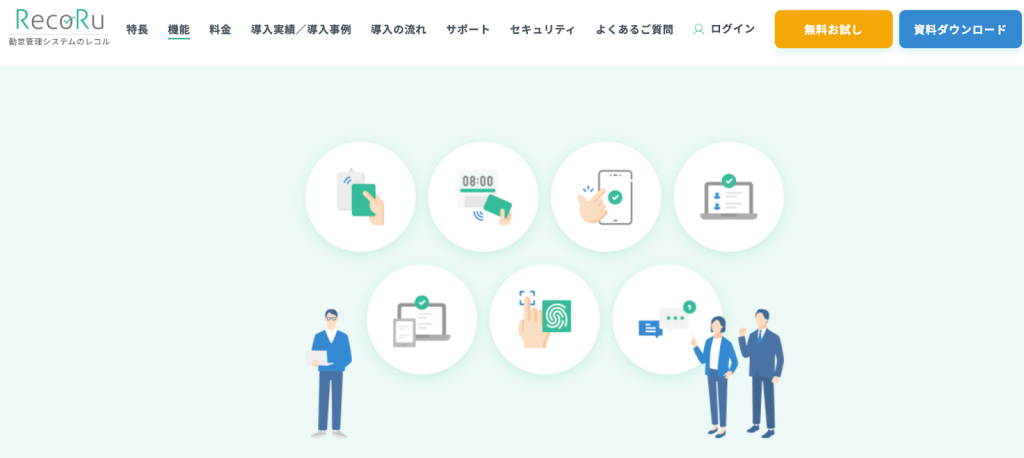 RecoRuは、機能も価格もシンプルな勤怠管理システムです。打刻はICカードのほか、生体認証やスマホアプリ、PC、タブレット、Slackなど、さまざまな方法に対応しています。