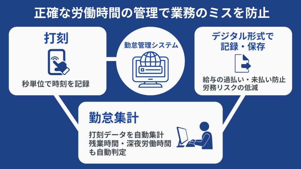 正確な労働時間の管理は、給与の過払い・未払い防止だけでなく、労務リスクの低減にも効果的です。