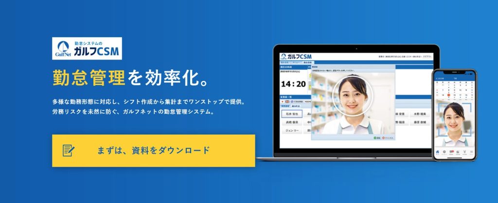 ガルフCSM 勤怠管理は、小売・飲食・サービス業などの多店舗展開企業に適した勤怠管理システムです。顔認証による打刻のほか、勤怠締め業務のサポートや有休付与の自動計算など、労務管理に役立つ機能を備えています。