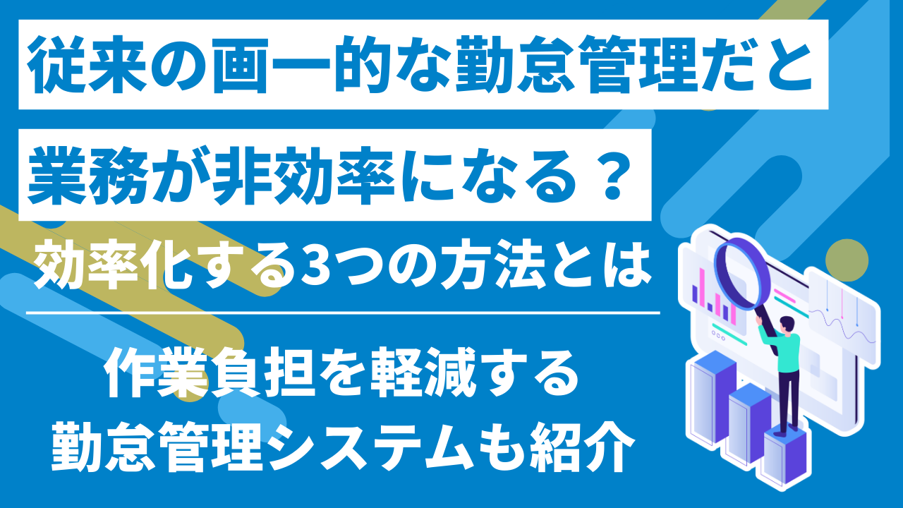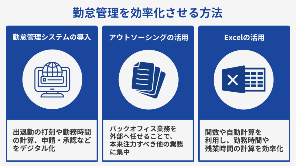 勤怠管理の効率化を進めるには、現在の業務フローを見直し、自社に合った改善方法を取り入れることが重要です。ここでは、勤怠管理を効率化する代表的な方法として、次の3つを紹介します。