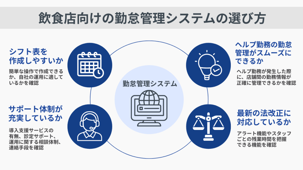 飲食店向けの勤怠管理システムを選ぶ際は、以下のポイントを確認することが重要です。