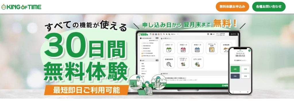 | KING OF TIME 勤怠管理 | 無料体験の段階で全機能を制限なく利用できる | 1ユーザー 月額330円(税込) |