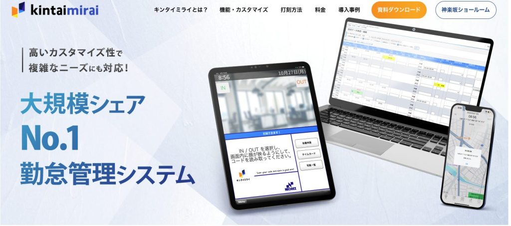 キンタイミライは、株式会社ネオレックスが提供する勤怠管理システムです。従業員数1,000人以上のホテルや物流、小売、飲食など、大規模な企業での導入実績が豊富で、複雑な勤務形態にも柔軟に対応できます。