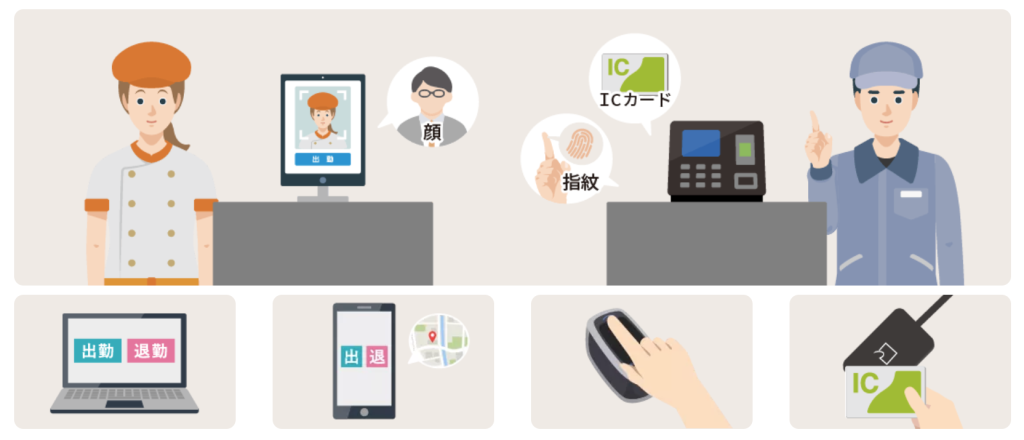 打刻方法はICカード・共用タブレット・GPS・スマホアプリなど幅広く、端末の持ち込みが制限される現場でも柔軟に運用できます。