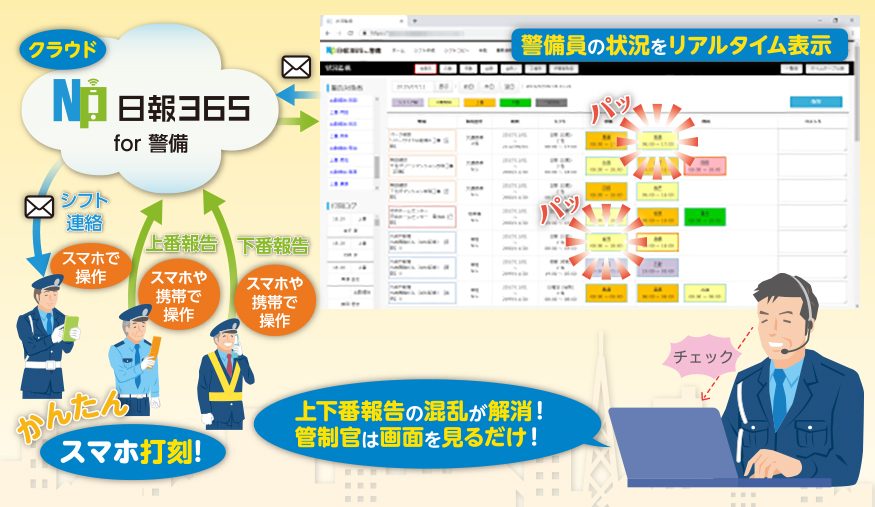 直行直帰が一般的な警備業界では、タイムカードや紙による勤怠管理が難しい現場も多くあります。また、電話による上下番報告は管制担当者の負担が大きくなる課題があります。