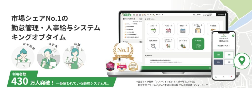 出典:勤怠管理・人事給与システム市場シェアNo.1 KING OF TIME(キングオブタイム)|株式会社ヒューマンテクノロジーズ