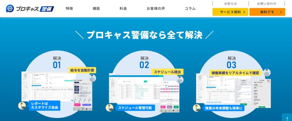 プロキャス警備は警備業界に特化したクラウド型勤怠・シフト管理システムです。現場配置から勤怠集計、請求書作成までを一元管理できる点が特徴です。