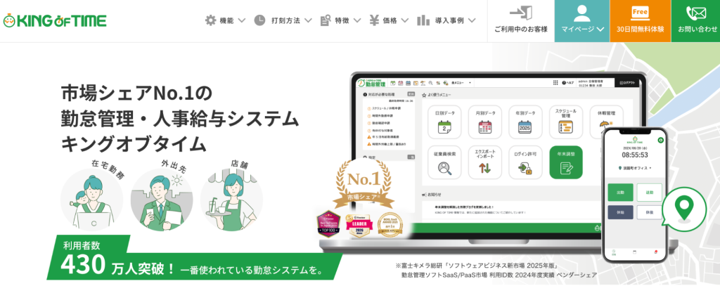 出典:勤怠管理・人事給与システム市場シェアNo.1 KING OF TIME(キングオブタイム)|株式会社ヒューマンテクノロジーズ