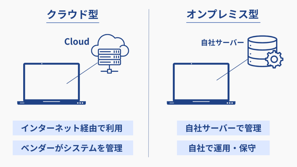 勤怠管理システムは、大きく「クラウド型」と「オンプレミス型」の2種類に分けられます。クラウド型は初期費用を抑えやすく、オンプレミス型は自社に合わせたカスタマイズがしやすい点が主な違いです。